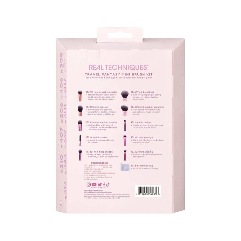 The Real Techniques Travel Fantasy Mini Brush Kit is an all-in-one full makeup brush set for a naturally, radiant glow. The makeup brush kit includes the 210 Mini Expert Concealer Brush, 407 Mini Multitask Brush, 206 Mini Contour Brush, 406 Mini Medium Sculpting Brush, 308 Mini Medium Shadow Brush, 313 Mini Definer Brush, 343 Mini Spoolie, 332 Mini Smudge Brush, 301 Mini Base Shadow Brush, 307 Mini Shading Brush, and a Mini Makeup Bag. These brushes can be used with liquid, cream, and powder products. They are perfect for taking on-the-go and traveling with. Both the makeup brushes and the makeup bag are small enough to fit in your purse or suitcase! The Travel Fantasy Mini Brush kit is easy to clean using our Real Techniques Brush + Sponge Cleansing Gel. These brushes are also 100% cruelty-free and made with UltraPlush synthetic bristles.